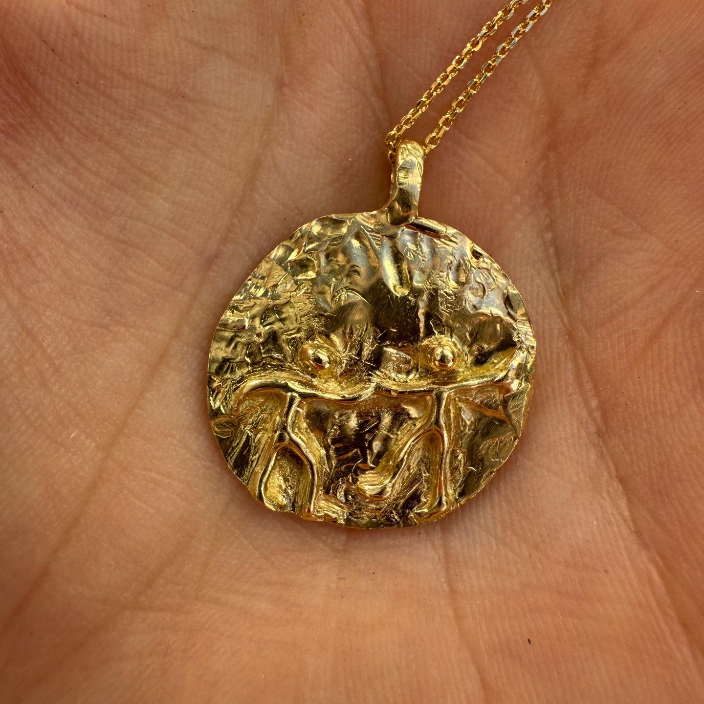 Durante el proceso en cera, cada persona marca la pieza con su huella, dejando una impresión real y única sobre el material. Ese gesto simple pero poderoso se transforma en una textura viva, orgánica, que permanece al ser fundida en oro.