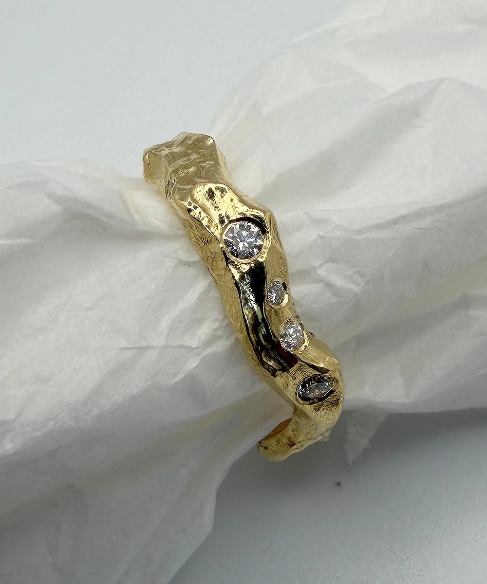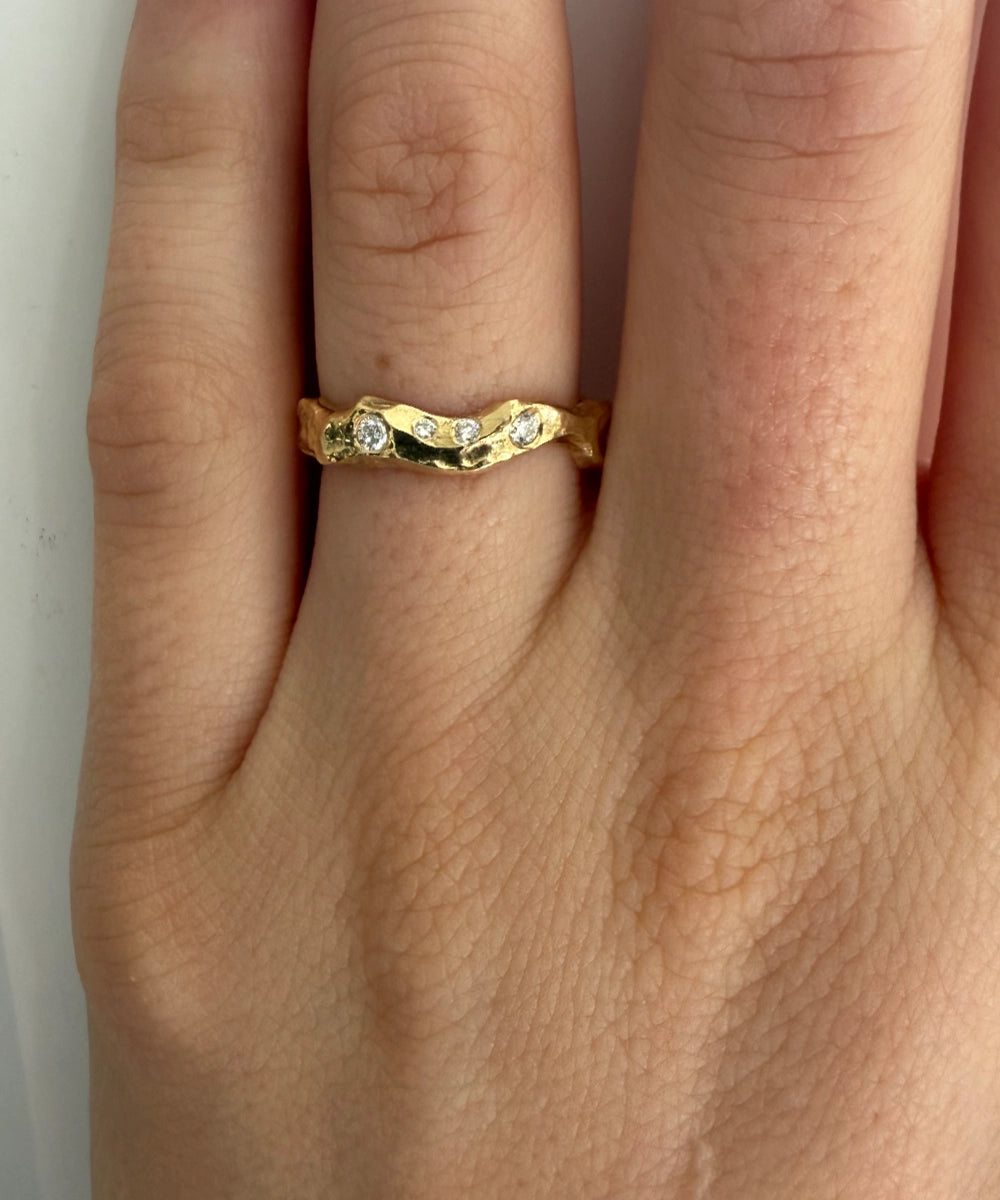Anillo de oro sólido elaborado artesanalmente y engastado con 4 diamantes. Cada piedra ha sido cuidadosamente seleccionada para garantizar que no haya dos iguales. Una pieza diseñada para acompañarte a ti y a futuras generaciones.
