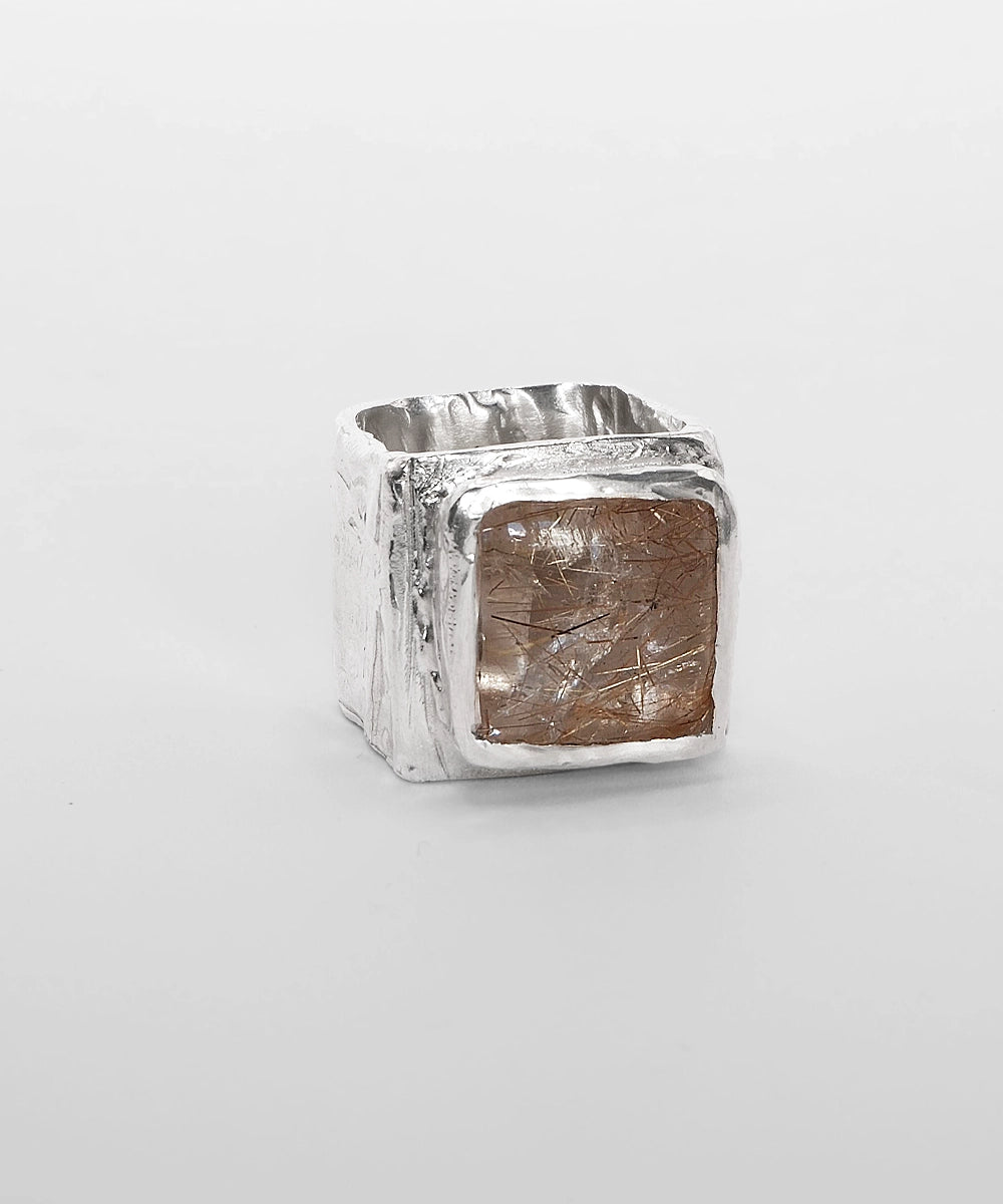 Anillo de plata reciclada elaborado artesanalmente y engastado con cuarzo rutilo único. Cada piedra ha sido cuidadosamente seleccionada para garantizar que no haya dos iguales.