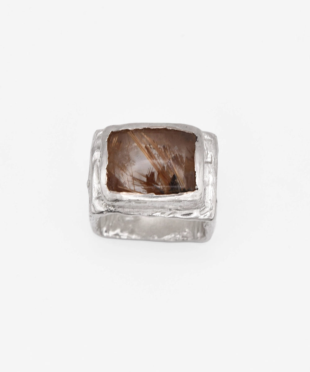 Anillo de plata reciclada elaborado artesanalmente y engastado con cuarzo rutilo único. Cada piedra ha sido cuidadosamente seleccionada para garantizar que no haya dos iguales.